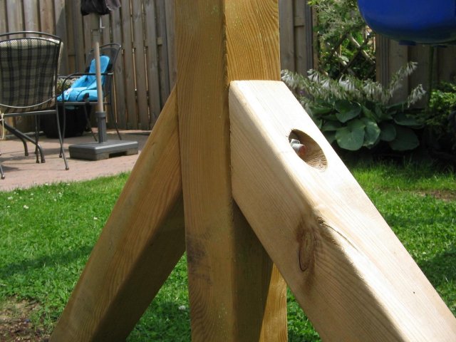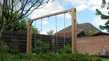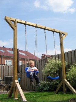 ConstructieDeze schommel wordt gemaakt van geïmpregneerde houten balken van 9x9 cm. compleet voorzien van gegalvaniseerde montagemiddelen en schommelhaken. Meer informatieAlle gaten zijn voorgeboord en zover als mogelijk afgemonteerd, dus alleen maar in elkaar schroeven en in de grond plaatsen. De palen staan +/- 80cm diep in de grond en kan dus niet omvallen. Voor extra stevigheid en stabiliteit worden de schuine stukken in de grond met de paal verbonden. Verder zijn er geen gevaarlijke uitstekende delen. |